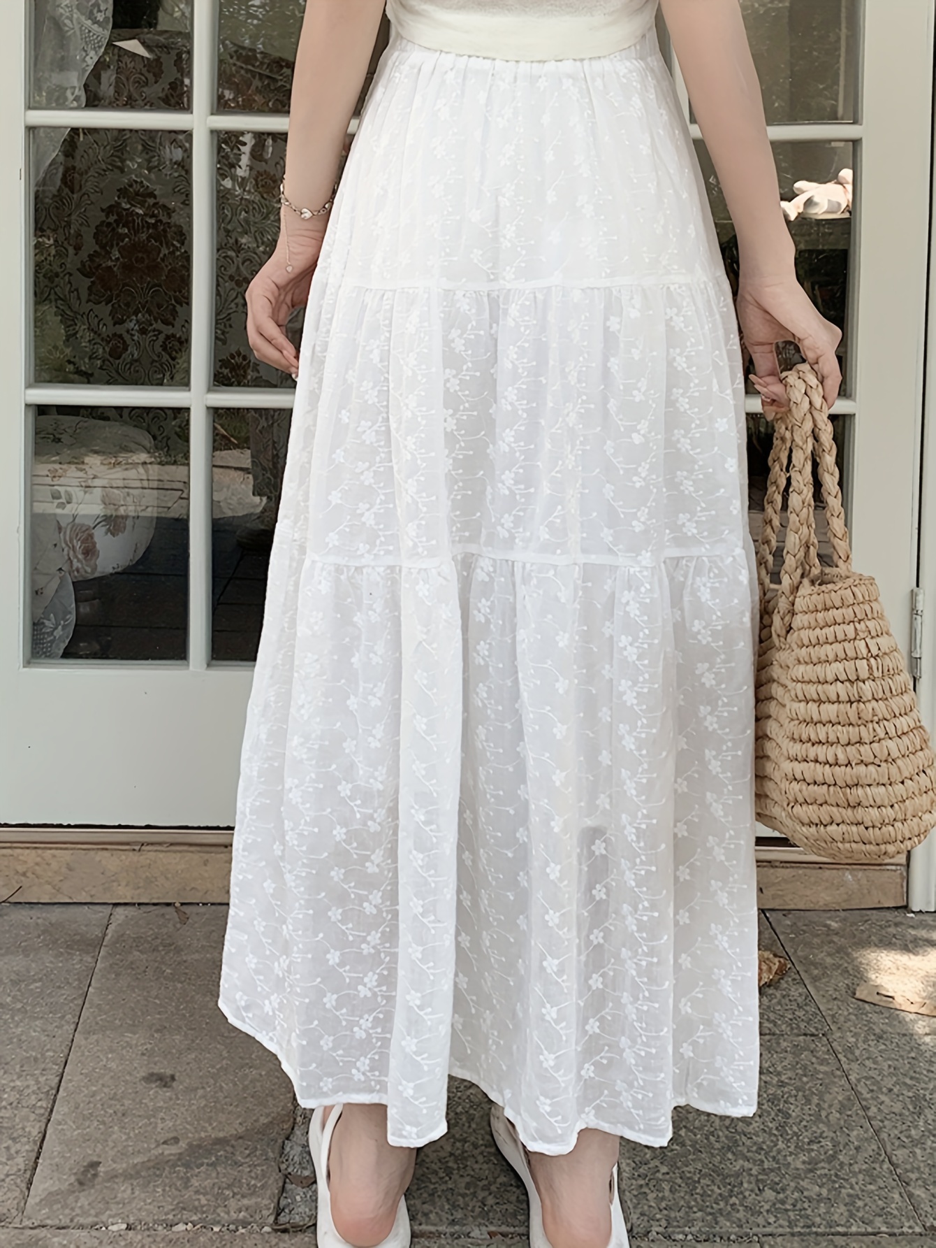 Floral Pattern High Waist Flared Skirt, Casual Tiered Mesh Maxi Skirt, Women's Clothing