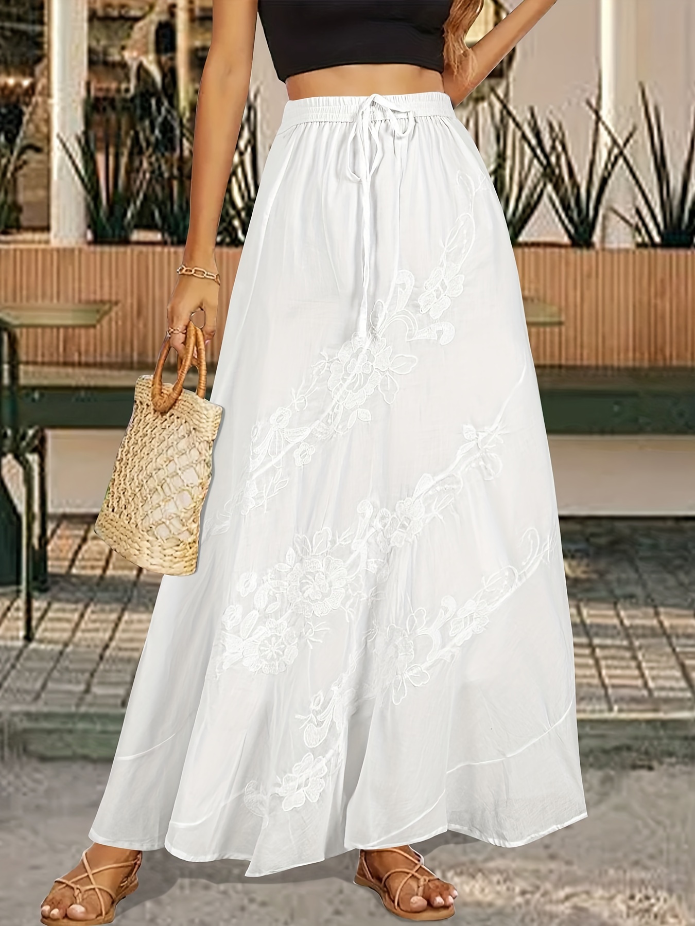 Solid Drawstring Waist Skirt, Elegant Beach Wear Swing Skirt For Spring & Summer, Women's Clothing