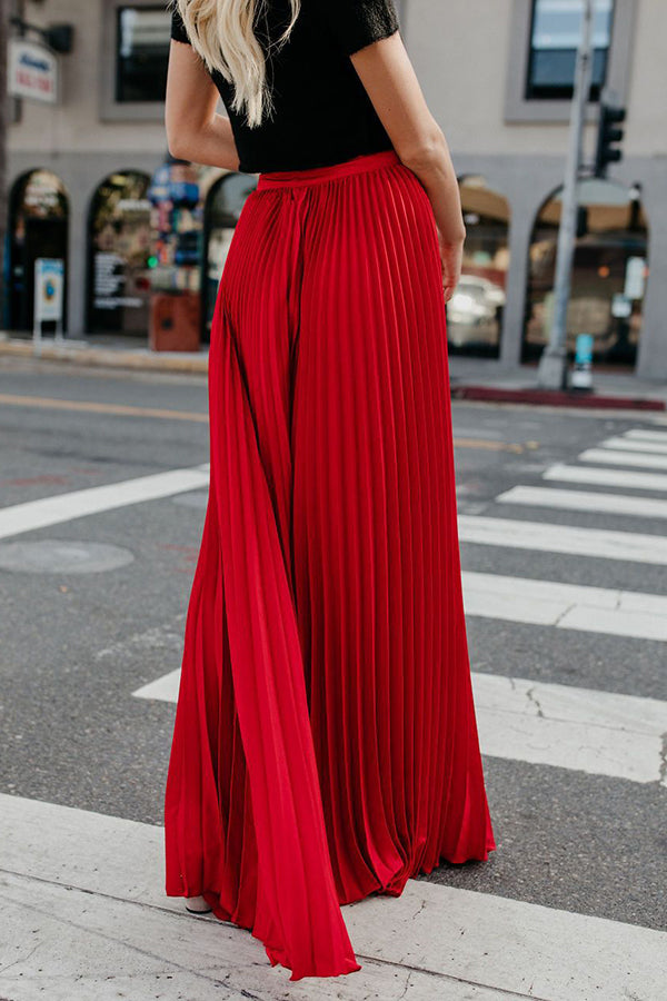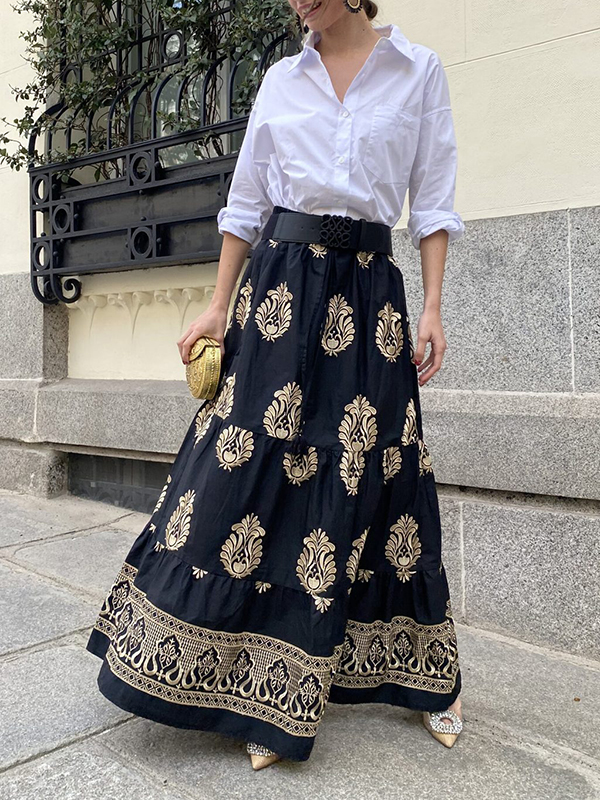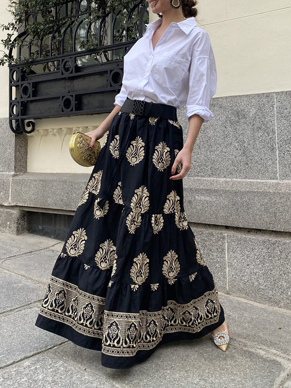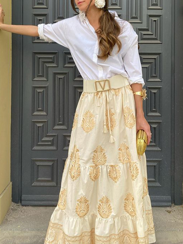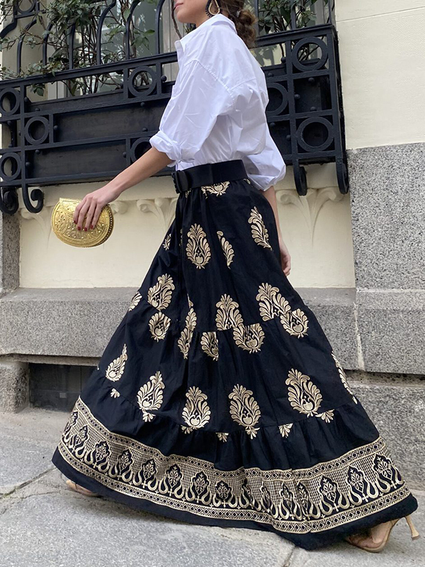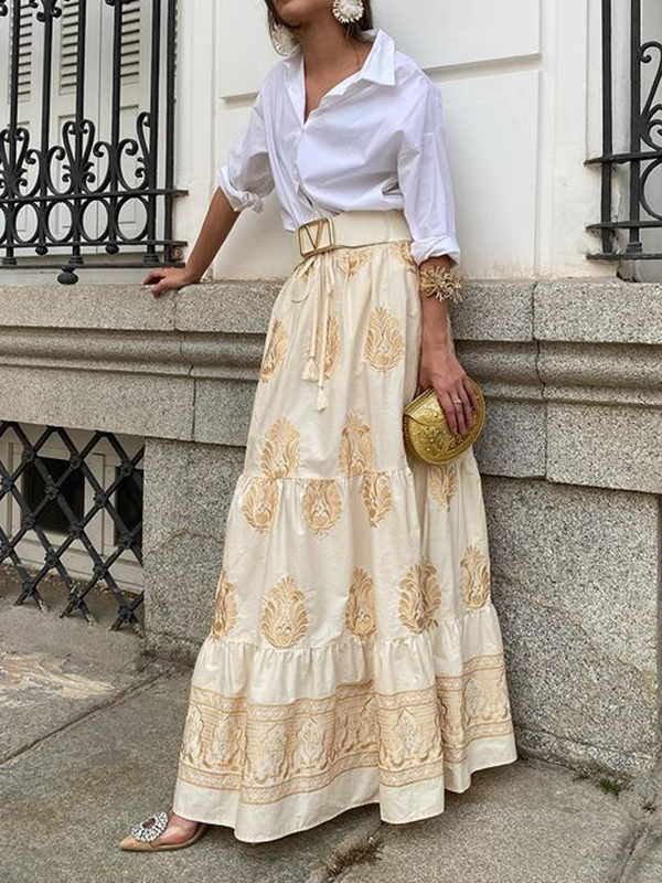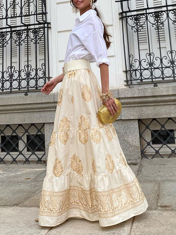 A-Line Loose Drawstring Flower Print Pleated Split-Joint Skirts Bottoms