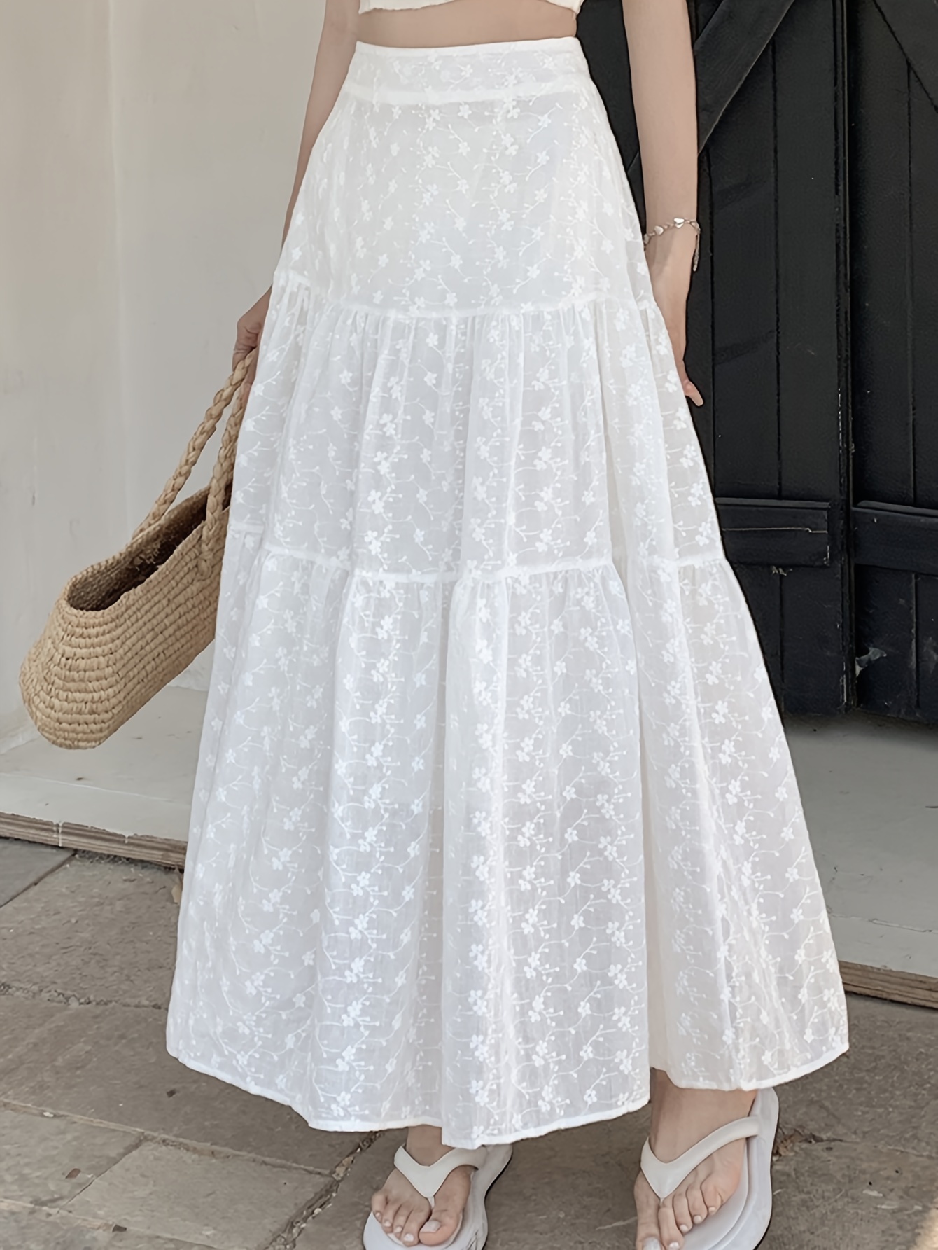 Floral Pattern High Waist Flared Skirt, Casual Tiered Mesh Maxi Skirt, Women's Clothing